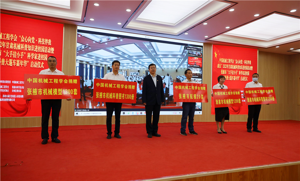 启动仪式上,中国机械工程学会为张掖市、酒泉市中小学共捐赠机械模型2500套、机械科普图书2500册、航模20架。