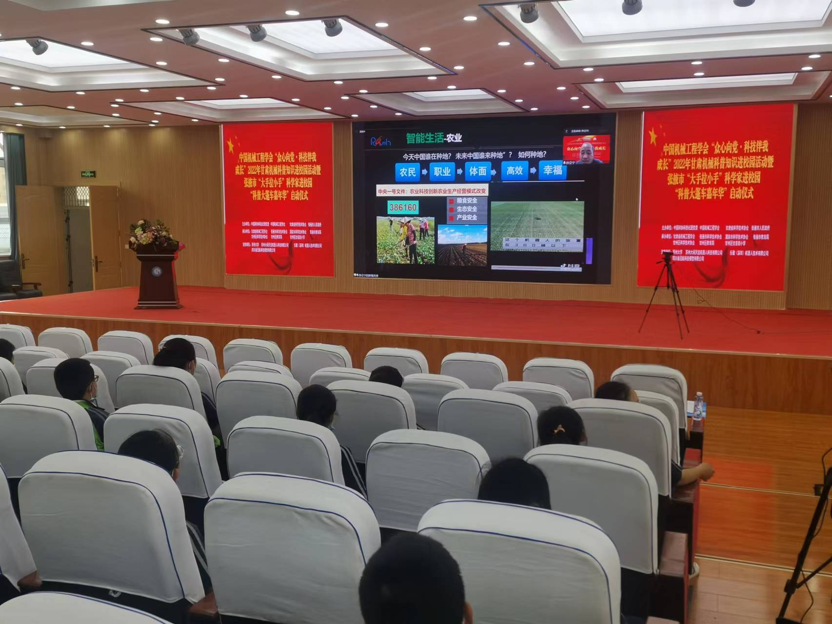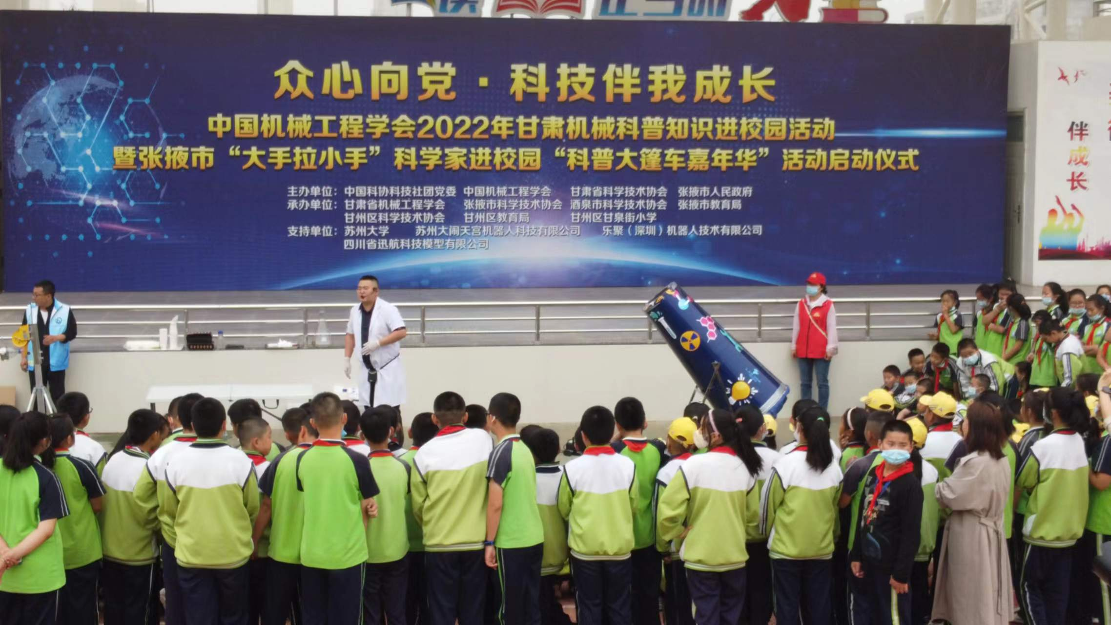 5月25日,由中国科协科技社团党委、中国机械工程学会、甘肃省科学技术协会联合主办,甘肃省机械工程学会、张掖市科学技术协会、酒泉市科学技术协会、张掖市教育局、甘州区科学技术协会、甘州区教育局、甘州区甘泉街小学承办,苏州大学、苏州大闹天宫机器人科技有限公司、乐聚(深圳)机器人技术有限公司、四川省迅航科技模型有限公司协办的“众心向党·科技伴我成长”2022年甘肃机械科普暨中国机械工程学会会员日活动在甘肃省张掖市隆重启动。