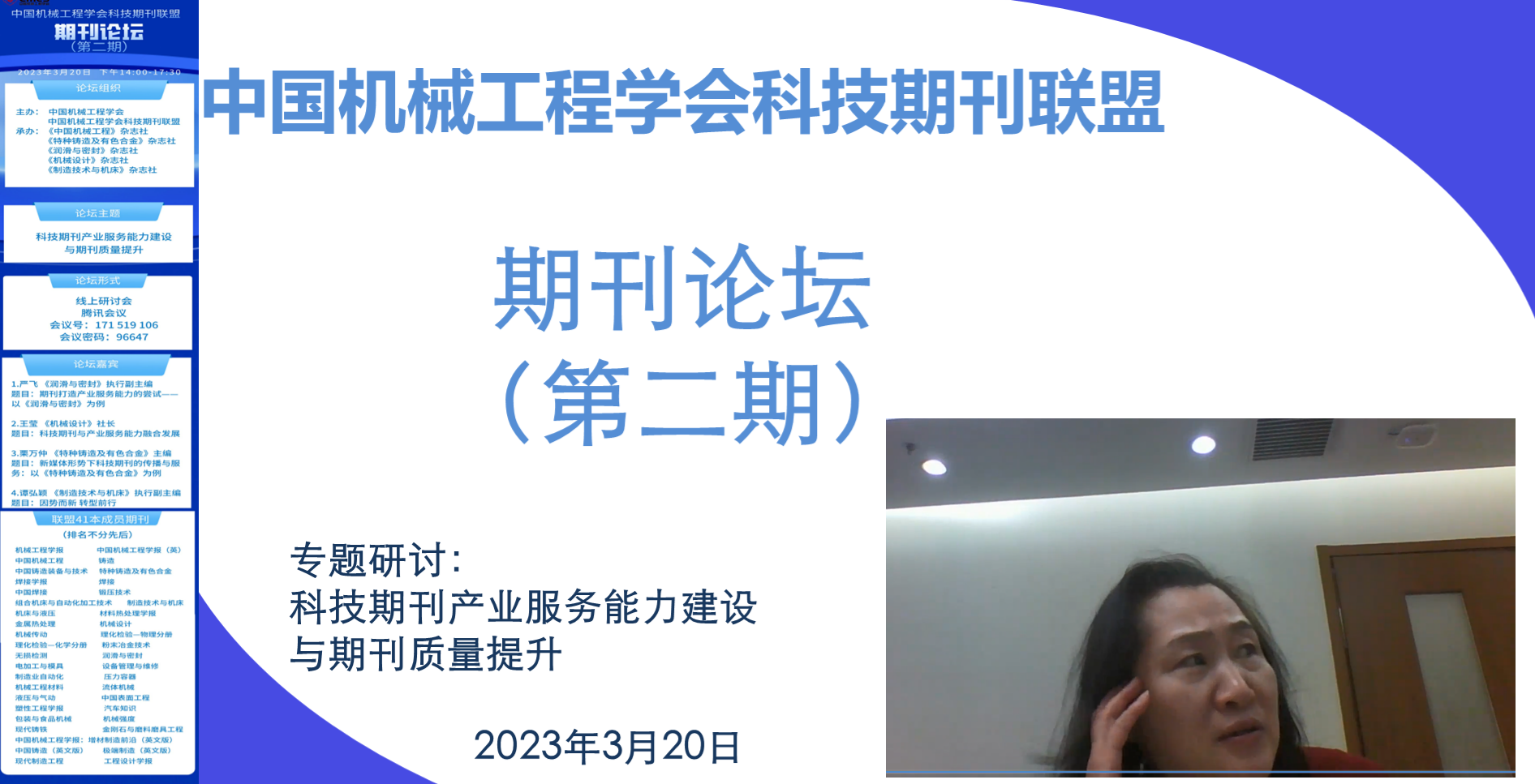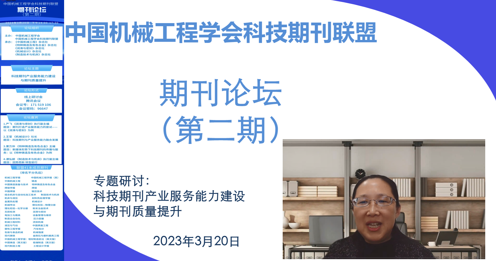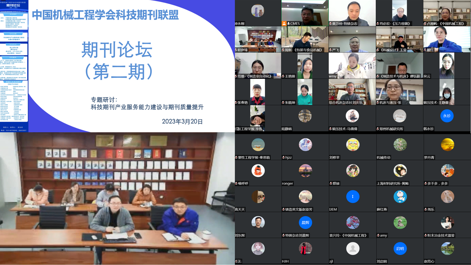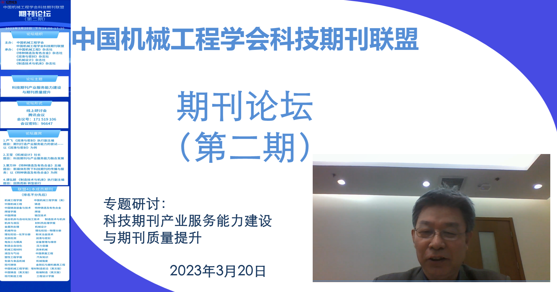 2023年3月20日,中国机械工程学会科技期刊联盟期刊论坛第二期采用线上方式顺利举行。本次活动聚焦科技期刊的产业服务能力建设与期刊质量提升。期刊联盟41本期刊的编辑、中国机械工程学会副秘书长陈超志及总部部分工作人员近100人参会。
