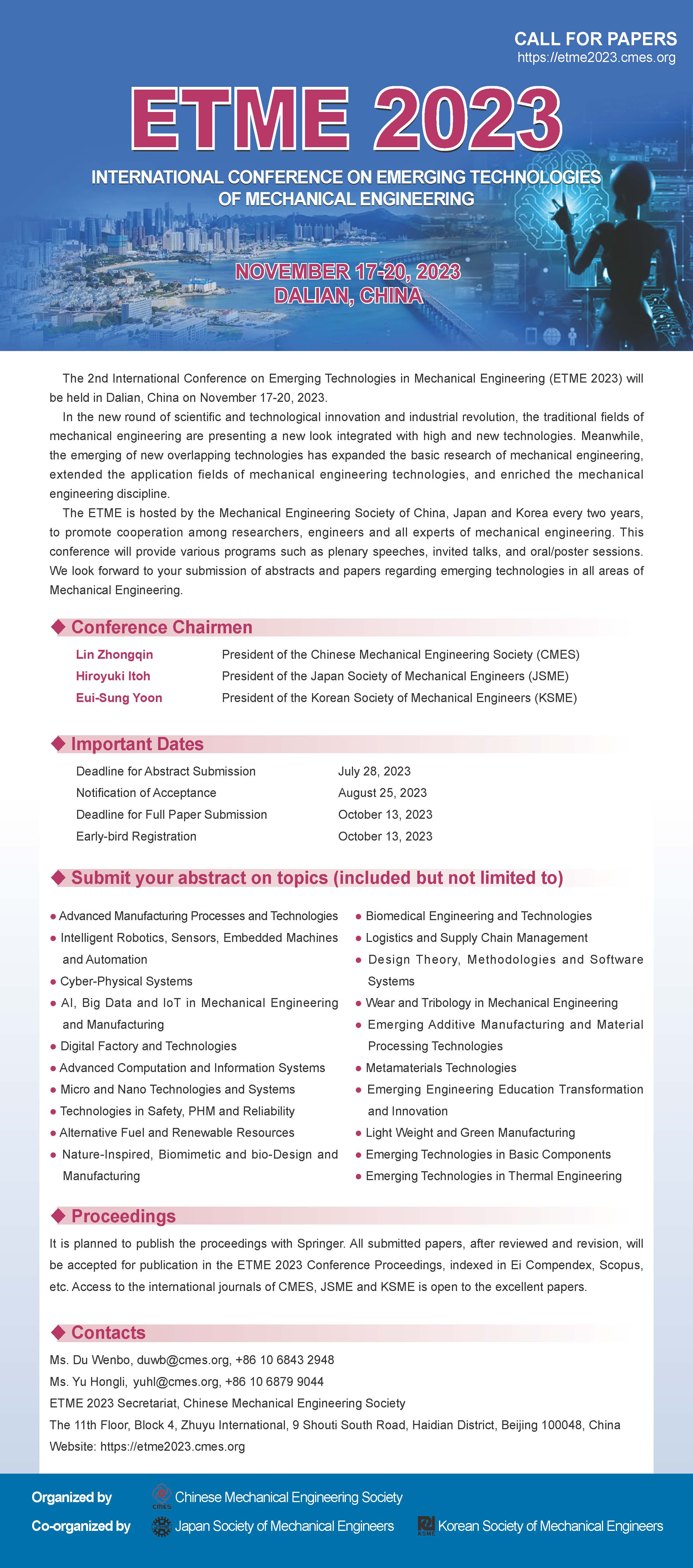 经过评审和修改后的论文将在ETME 2023会议论文集上发表,会议论文集由Springer出版社出版,并在Ei Compendex, Scopus等收录。会议优秀论文可推荐到CMES,JSME和KSME的国际期刊,获得发表机会。