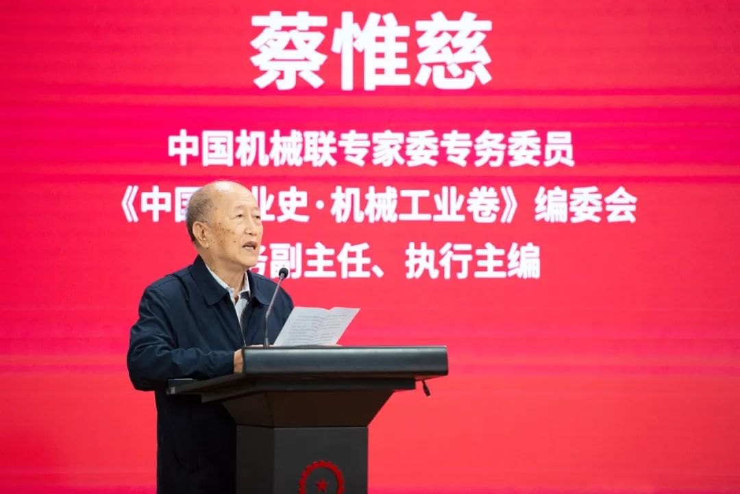 机械卷编委会常务副主任、执行主编蔡惟慈以一个行业老兵的身份做了发言。发言中简要回顾了自己自60年代大学毕业后与机械工业结缘55年的工作经历,表达了在晚年有幸参与修史的激动心情与行业情怀,表达了对所有组织者、参与者的感谢。