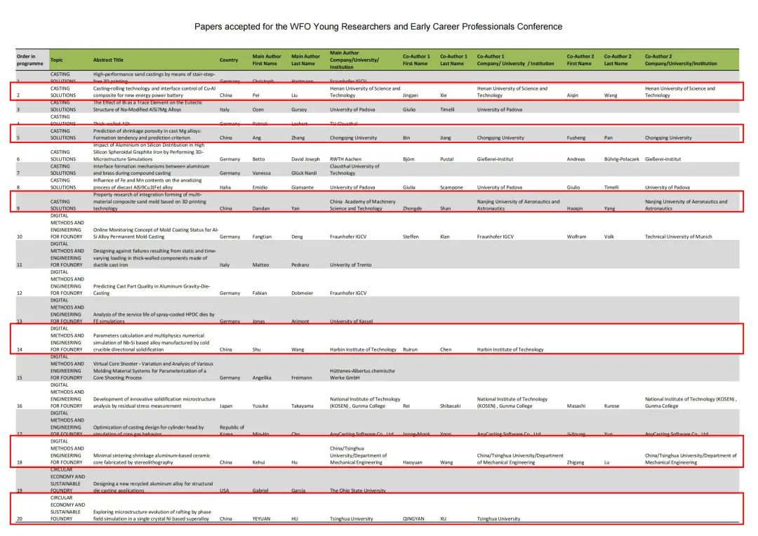 中国机械工程学会铸造分会作为世界铸造组织(WFO)中国的唯一官方代表以及本届会议的组织成员之一,全面负责组织开展中国铸造科技青年工作者的申报及选拔推荐工作。通过征集及选拔评审,中国机械工程学会铸造分会于2023年2月15日向世界铸造组织(WFO)推荐了14位科技青年代表中国参加全球前20名的竞选资格。