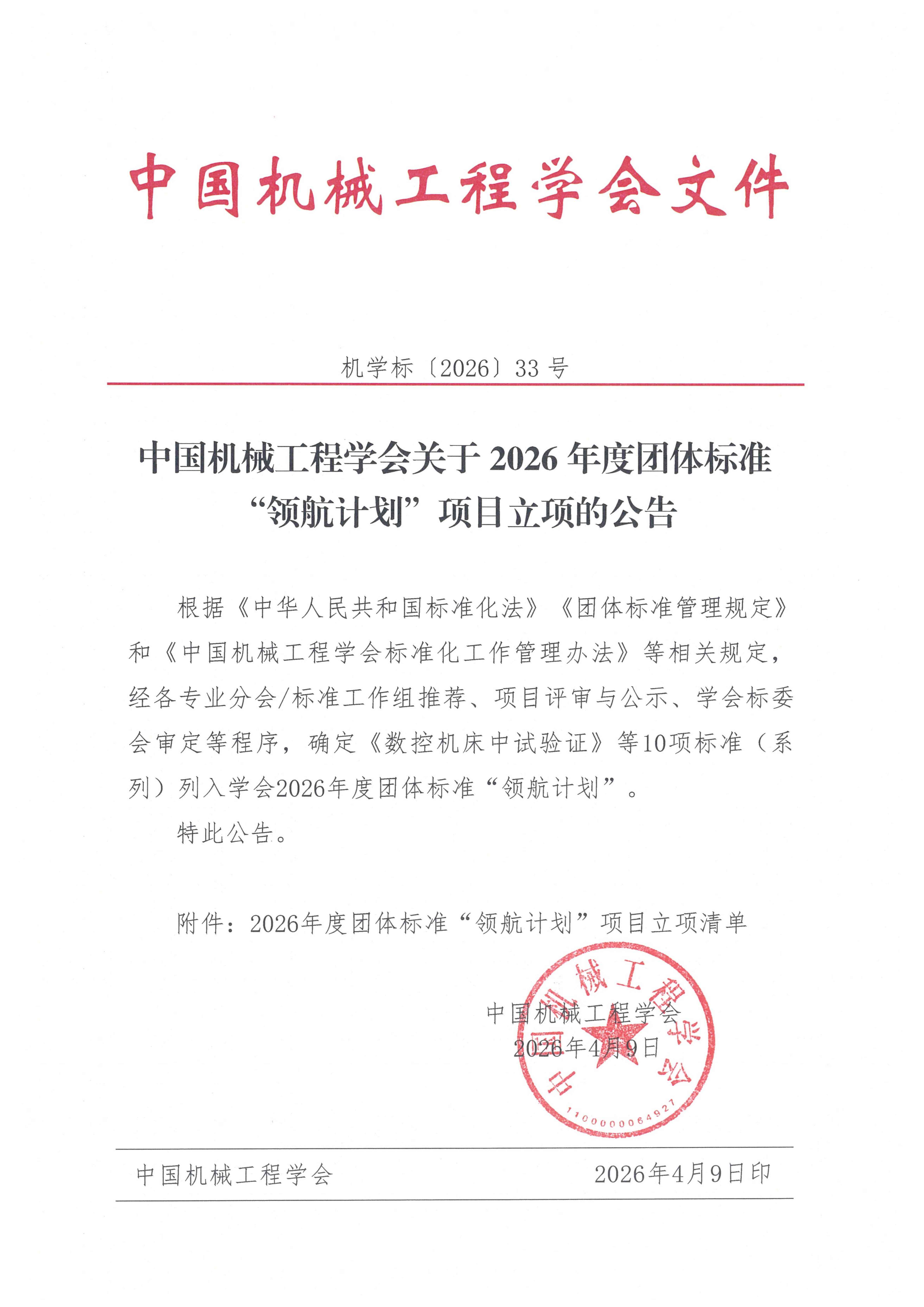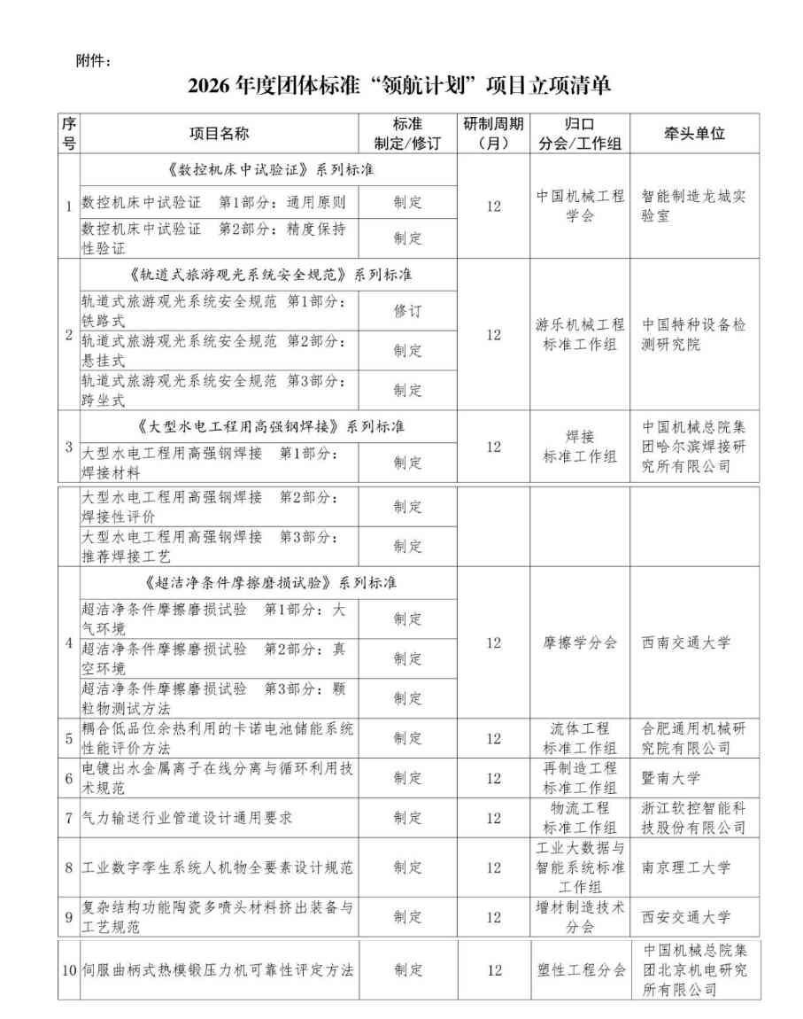 附件: 中国机械工程学会关于2026年度团体标准“领航计划”项目立项的公告