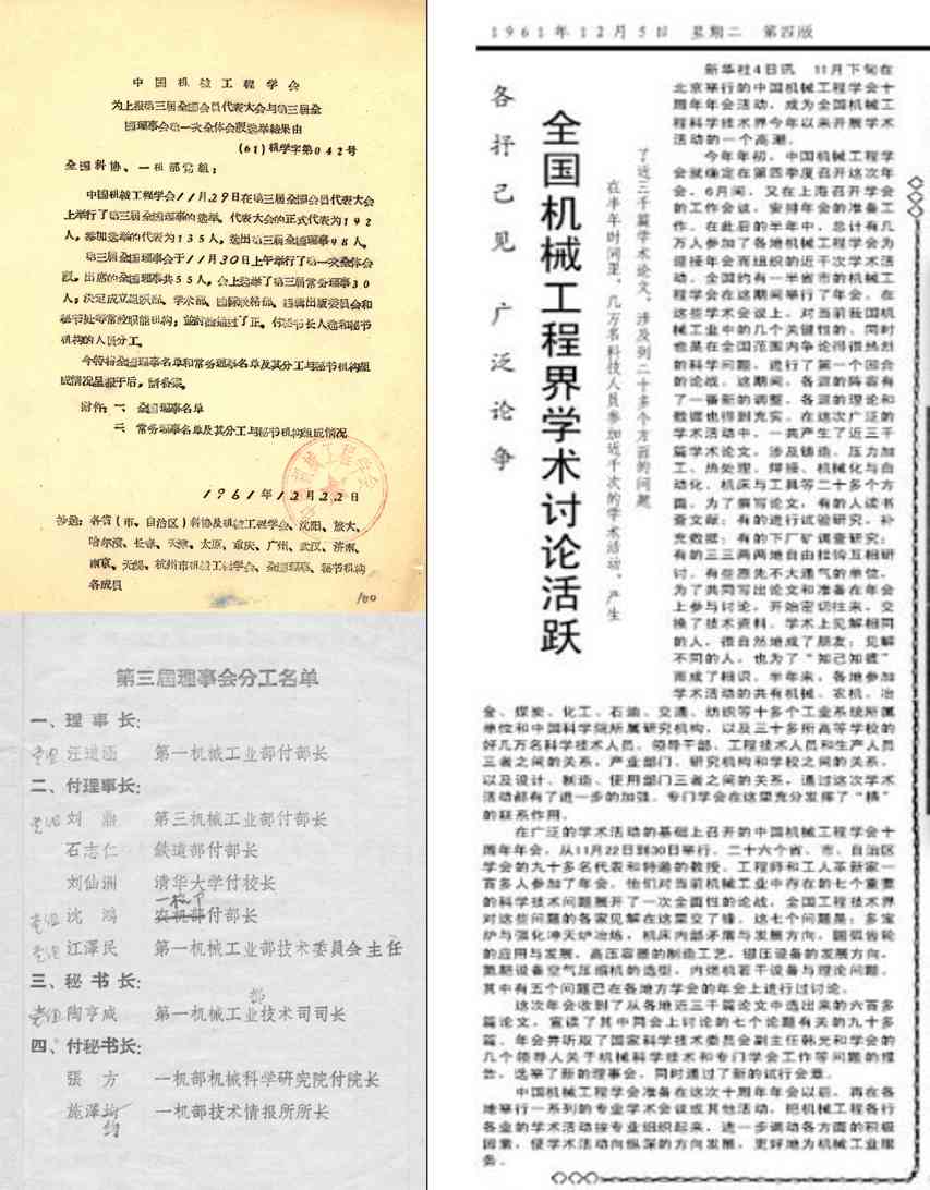 左:第三届全国会员代表大会选举第三届理事会及分工名单;右:右:1961年12月5日,人民日报刊发的会议报道