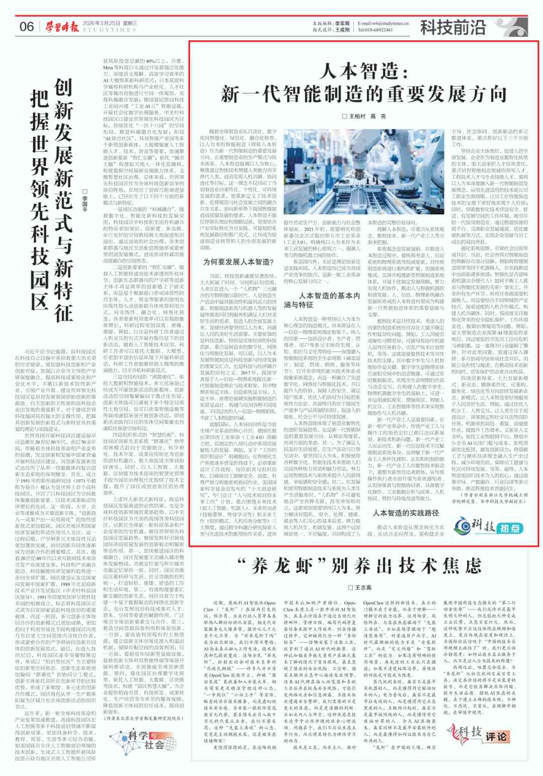 《学习时报》刊发人本智造领域学者署名文章——人本智造:新一代智能制造的重要发展方向,作者:浙江大学王柏村,华中科技大学高亮。
