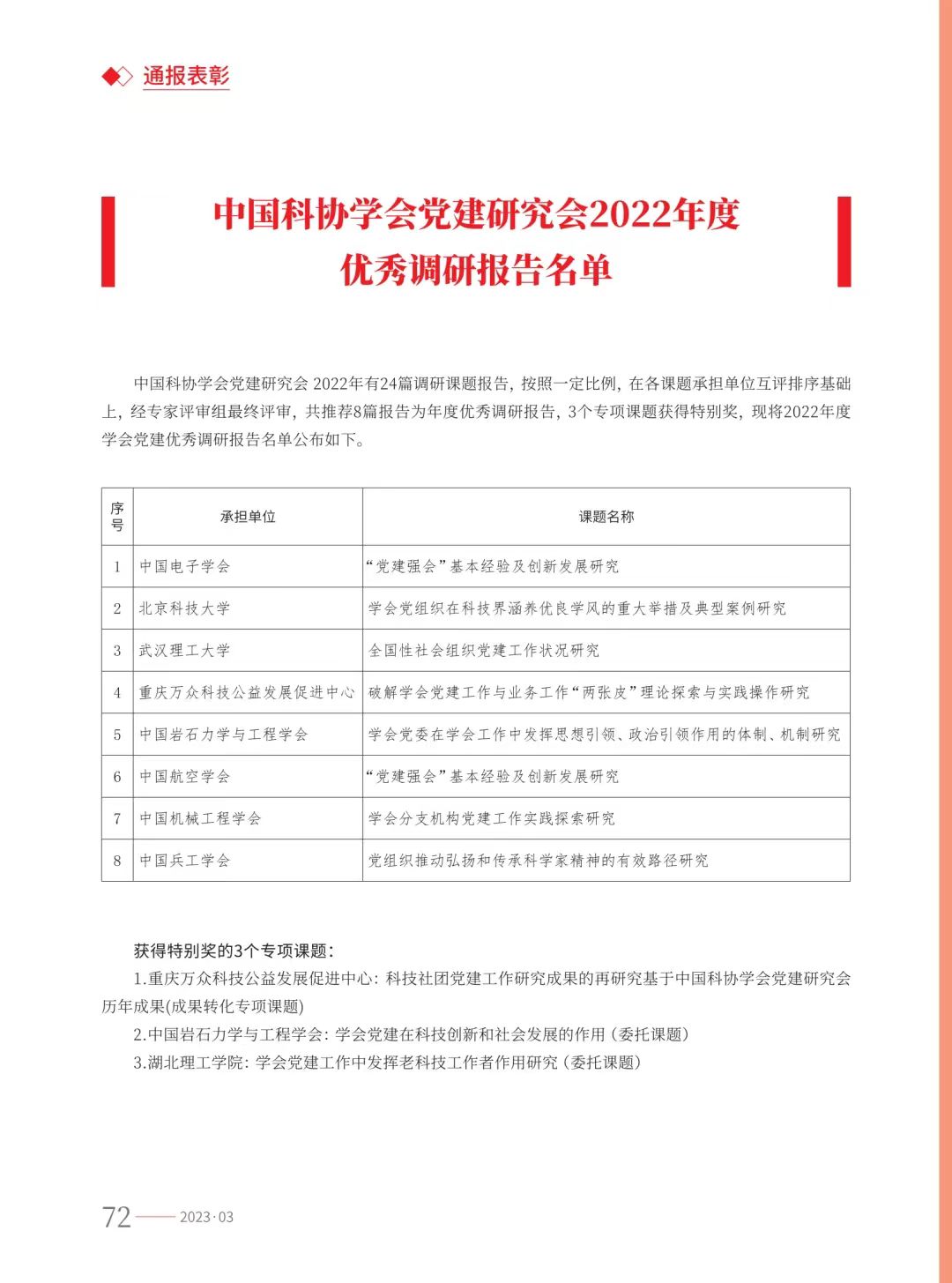 我学会撰写的“学会分支机构党建工作实践探索研究”获优秀调研报告。