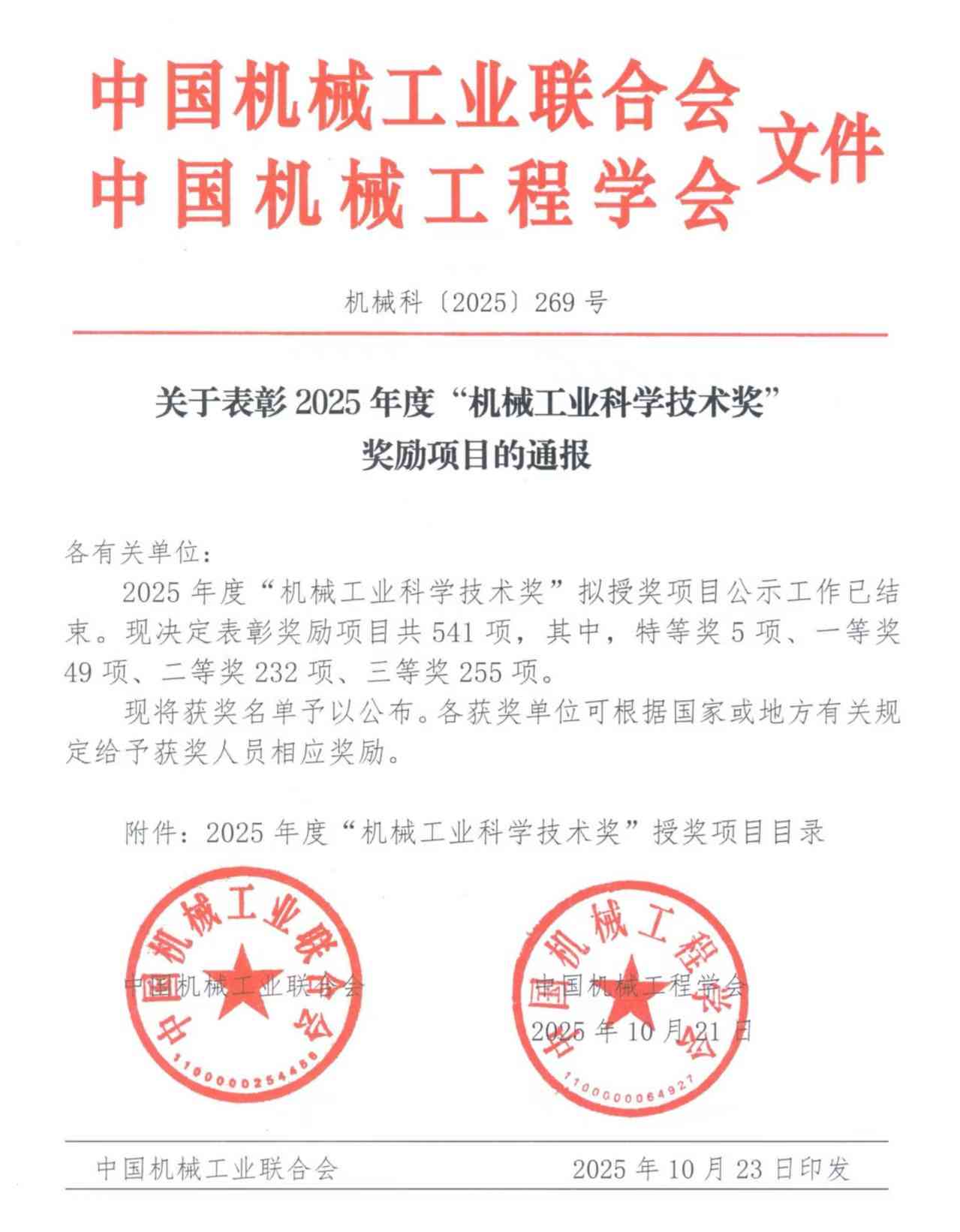 关于表彰2025年度“机械工业科学技术奖”奖励项目的通报