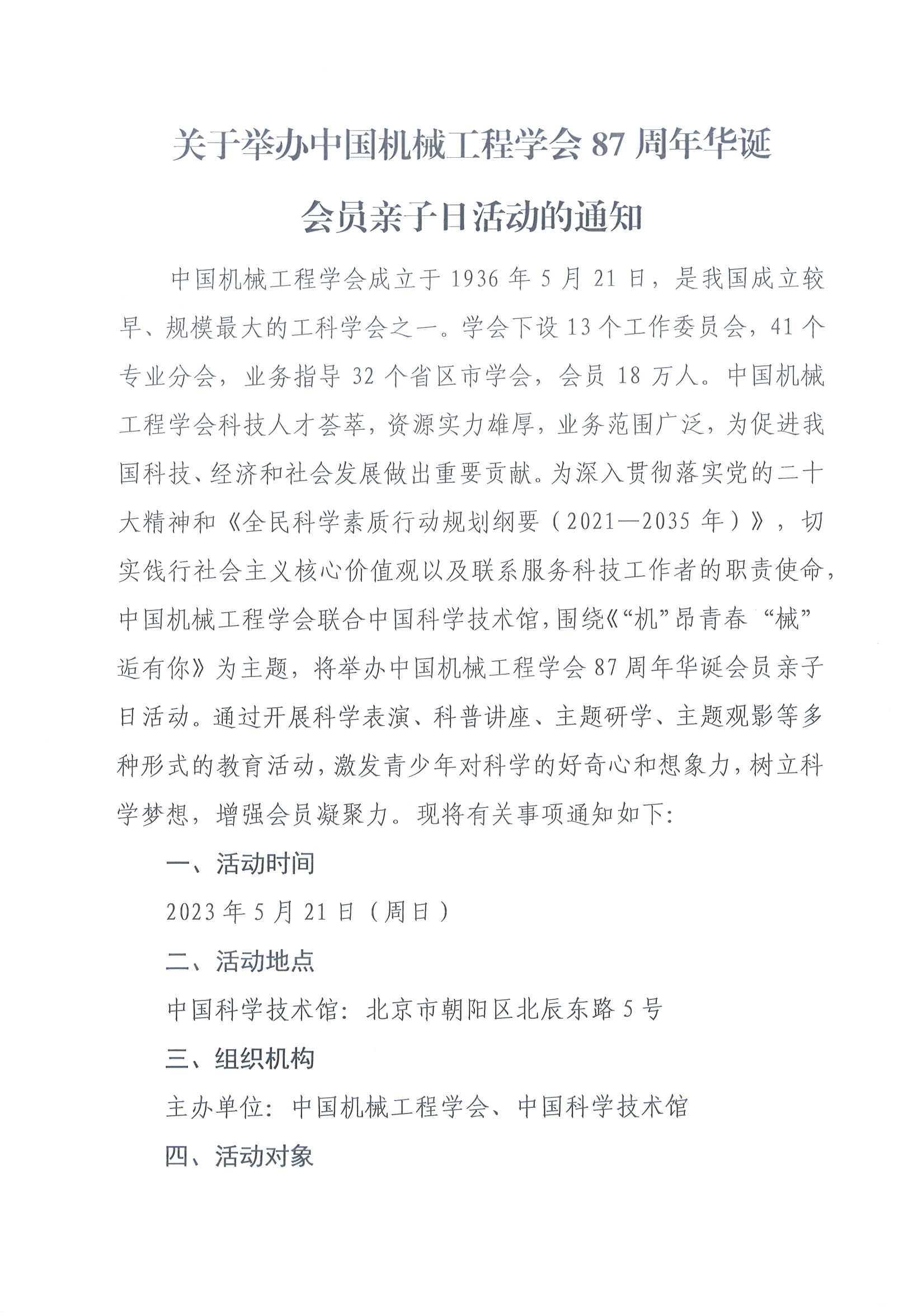 关于举办中国机械工程学会87周年华诞会员亲子日活动的通知
