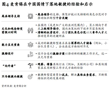 上述五个角度只供中国车企参考,究竟什么样的“敏捷转型”之路适合自己,还是应该交由企业自行判断。值得一提的是,这五大特征虽说各有千秋,但我们的经验和研究结果表明,只有五项特征共同发挥作用,企业才能实现真正的敏捷。一方面,管理层需要站得更高、看得更远、做得更快,精准把控时机并及时调整业务方向。他们在灵活建立网格式架构和精简流程的同时,必须全力协调各部资源、盘活组织,缩短产品周期,并充分实现信息在组织内外的快速交互。唯有让产品充分体现出市场和客户需求,企业才能提升交付质量,改进客户关系。另一方面,管理层必须提升企业的凝聚力,在组织上下贯穿统一的使命和愿景。在践行“以人为本”理念的过程中,注重核心人才和核心能力的培养,加强员工归属感,提升组织整体能力。此外,基于我们在中国的敏捷实践经验,我们总结了实现敏捷转型的六大关键成功因素(见图4)。