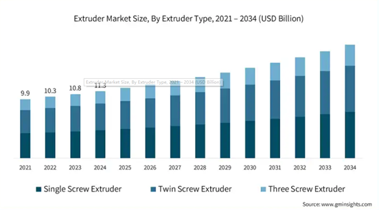 2025年7月,全球市场机构(GMI)发布《2025~2034年全球挤出机市场规模》报告。根据报告,2024年全球挤出机市场规模估计为113亿美元。预计该市场规模将从2025年的118亿美元增长到2034年的191亿美元,复合年增长率为5.5%。
