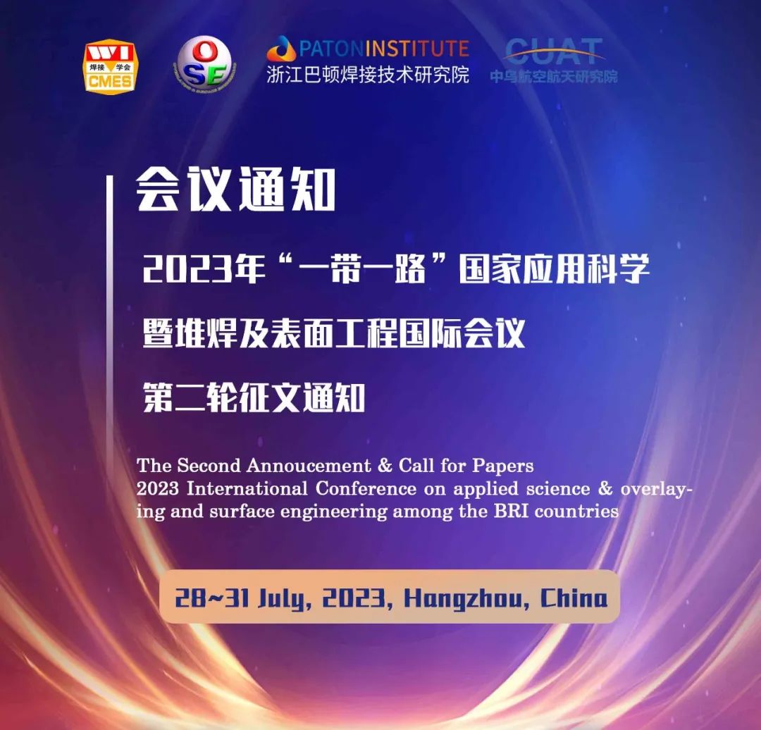 为了积极响应号召,助力双碳目标实现,中国机械工程学会焊接分会联合中国焊接协会表面工程与增材制造工作委员会、中国建材机械工业协会焊接专业技术委员会、浙江巴顿焊接技术研究院、中乌航空航天研究院等单位,依托中国科协“一带一路”国际科技组织合作平台,于2023年7月28—31日在浙江省杭州市召开2023年“一带一路”国家应用科学暨堆焊及表面工程国际会议。