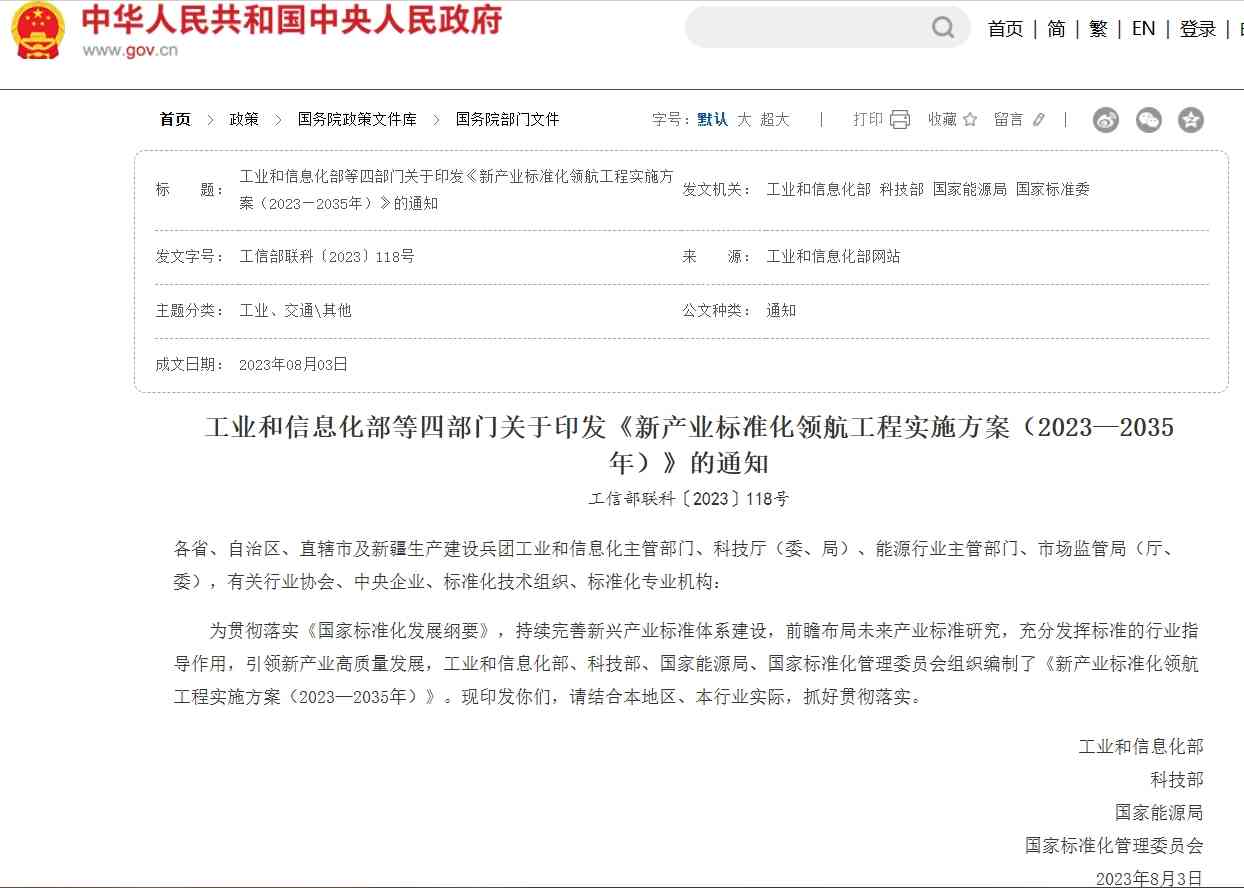 为贯彻落实《国家标准化发展纲要》,持续完善新兴产业标准体系建设,前瞻布局未来产业标准研究,充分发挥标准的行业指导作用,引领新产业高质量发展,工业和信息化部、科技部、国家能源局、国家标准化管理委员会组织编制了《新产业标准化领航工程实施方案(2023—2035年)》。现印发你们,请结合本地区、本行业实际,抓好贯彻落实。